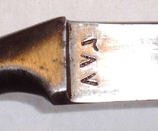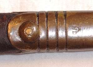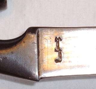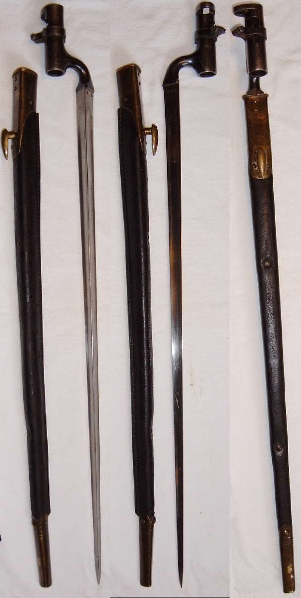 Das Modell 1895 fällt eigentlich aus dem Rahmen meines Sammelgebietes, da es sich um ein Tüllenbajonett handelt, welche ich ja eigentlich aus meiner Sammlung ausgenommen habe. Aber nunja, Ausnahmen gibt es immer wieder ...! Das Modell 1895 ist für einen einschüssigen Hinterlader, das Martini-Enfield im Kaliber .303, bestimmt. Es ist sehr ähnlich dem Modell 1876, weicht jedoch in der Gestaltung der Tülle ab. Der Gang der Tülle ist um 90 Grad im Vergleich zum 1876 verdreht, steht nun also im Winkel zum Bajonettarm. Auch ist der Bogen über dem Gang deutlich höher, um das im Vergleich höhere Korn passieren zu lassen. Das vorliegende Stück hat keinerlei britische Markierungen (mehr?), nur Farsi-Zeichen bzw. Zahlen, weshalb ich von einer ägyptischen Verwendung ausgehe - gesichert ist diese Vermutung jedoch nicht! Es ist jedoch in einer britischen Lederscheide versorgt, bei der am Mundblech noch Feilspuren zu sehen sind, wo die britischen Stempel entfernt wurden, während der Stempel des Ortbleches noch vorhanden ist. Das vorliegende Stück trägt die Herstellermarke von Wilkinson (WSC = Wilkinson Sword Company). |