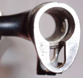 | unten: Draufsicht auf die Tülle; gut erkennbar die hohe Brücke über den Gang sowie der rechte Winkel zum Arm | ||