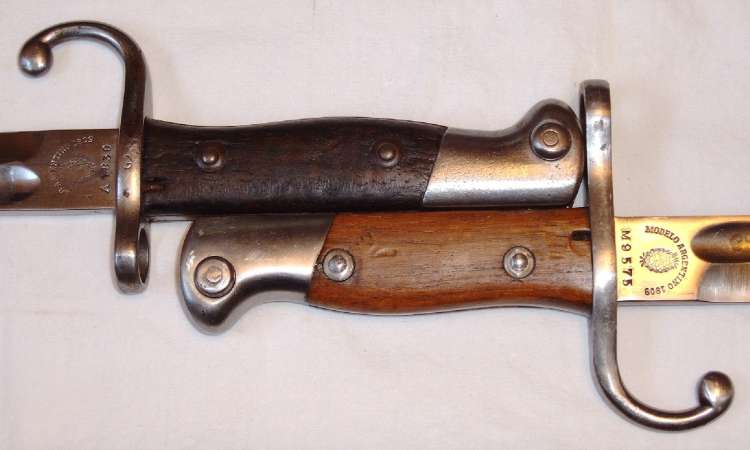 Das erste Modell wurde bei Weyersberg gefertigt. Es hat ein Gefäß in den Dimensionen für den Seitengewehrhalter des Gewehres M 1909, also ohne den später eingeführten Adapter, mit dem das zweite Modell aufgepflanzt wird. Dieses 2. Modell wurde von 2 Herstellern gefertigt, Weyersberg in Deutschland, und parallel auch in Argentinien selbst, von FMAP. Es hat einen größeren Abstand zwischen Mündungsring und Gefäßrücken, sowie ein insgesamt kürzeres Gefäß. Die ersten Stücke von Weyersberg wurden aus Rohlingen für das erste Modell gefertigt, deren Gefäße gekürzt wurden. Dabei geriet das bereits gebohrte Loch für die Griffschalenniete sehr nahe an den Knauf, so daß bei vielen Stücken die Niete vom Knauf angeschnitten wurde. Die von FMAP gefertigten Stücke haben eine T-förmige Kastenfräsung, während die Weyersberg-Stücke eine TO-Fräsung haben (sowohl 1. als auch 2. Modell). |