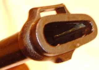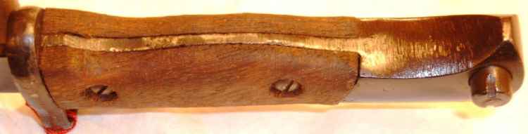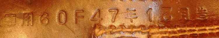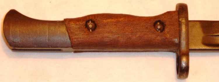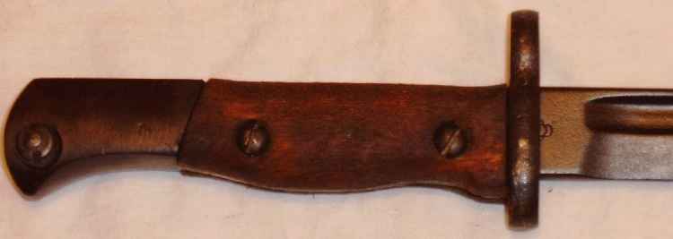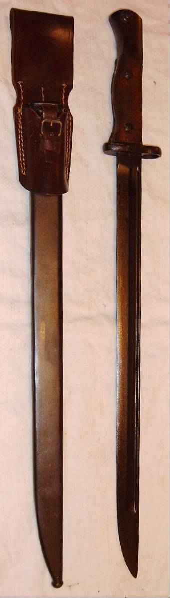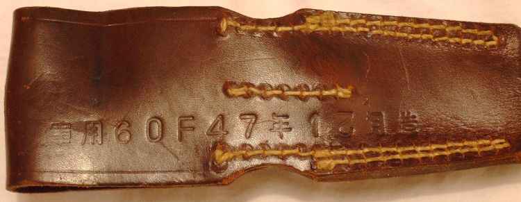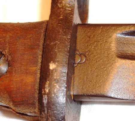 Die Scheide ist ebenfalls noch die Originalscheide. Der Koppelschuh trägt chinesische Schriftzeichen, ist also in China ergänzt wurden Die Schriftzeichen geben Aufschluß über den Fertigungszeitpunkt des Koppelschuhes. NACHTRAG: Es gibt Anzeichen, daß der Koppelschuh eine Fälschung ist!Die Schreibweise spricht für eine Fertigung nach 1956, was nicht zum Fertigungszeitraum des Bajonettes passt! |