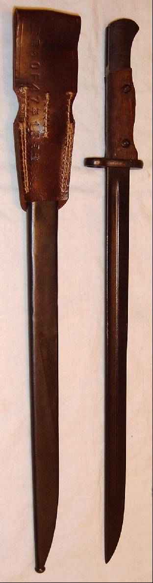 | Dieses Bajonett besteht aus einem neu gefertigten Gefäß für eine Bajonetthalterung System 98 und eine daran angesetzte Klinge eines japanischen Arisaka-Bajonettes. Der Herstellerstempel des japanischen Kokura-Arsenals ist noch vorhanden.