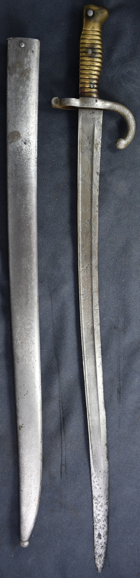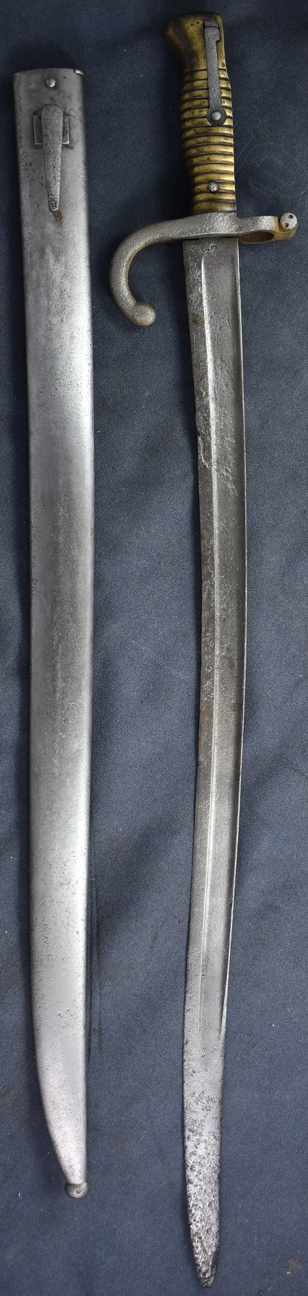 Das Bajonett wurde eventuell im deutsch-französischen Krieg 1870/71 erbeutet, und später modifiziert an (vermutlich) deutsche Truppen ausgegeben. Allerdings wurden zu Beginn des Weltkrieges auch Seitengewehre von Händlern angekauft und anschließend modifiziert, so daß die ursprüngliche Quelle dieses Stücles unklar ist. Das vorliegende Stück ist für das deutsche Gewehr 88 modifiziert, indem der Griffrücken abgestuft, der Ring verschmälert und angefast und der Drücker versetzt/verlängert wurde . Der ursprüngliche Hersteller war Alex Coppel in Solingen. Ein Abnahmestempel ist vorhanden., aber nicht mehr erkennbar. Das Seitengewehr ist leider in einem schlechten Zustand. Die zugehörige Scheide wurde ebenfalls modifiziert, indem der typisch französische Bügel für den Riemen des Koppelschuhes entfernt, und statt dessen ein deutscher Tragehaken angebracht wurde. Der Tragehaken lehnt sich in der Form an den der Scheide zum SG 1871 an, und trägt einen Abnahmestempel. |