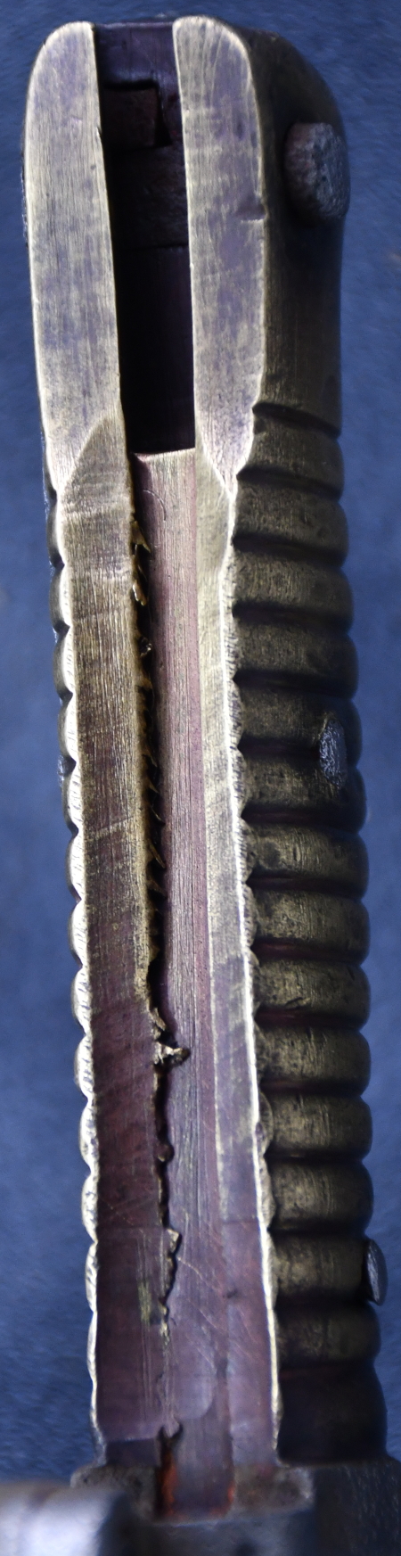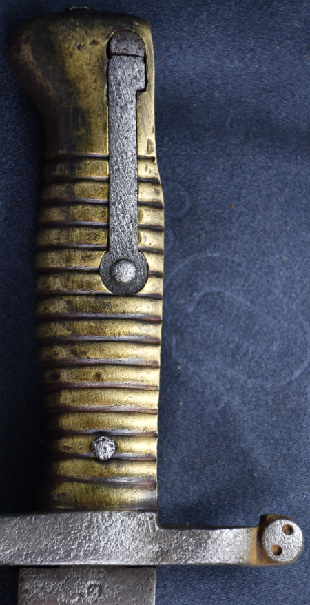 | Dieses Bajonett ist ein modifiziertes ehemaliges französisches (?) Bajonett für das Remington-Rolling-Block-Gewehr.