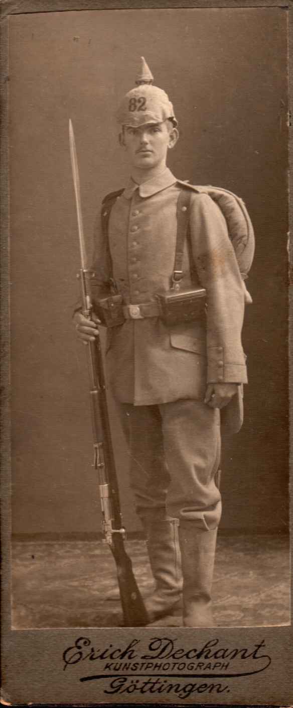 | Der Soldat auf diesem Bild ist offensichtlich kein Artillerist, denn er trägt einen Infanteriehelm (mit Spitze, nicht mit Kugel), und eine Widmung deutet auf einen Musketier hin.					 Trotzdem hat er ein Ari-SG 71/98 aufgepflanzt. Das Bild wurde am 19.04.1915 in Göttingen aufgenommen, und trägt auf der Rückseite eine Widmung des Musketiers W. Haase. Aufgrund der Helmnummer ist eine Zuordnung zum 2. Kurhessischen Infanterie-Regiment Nr. 82 möglich, dessen Standort auch in der Tat Göttingen war.  |