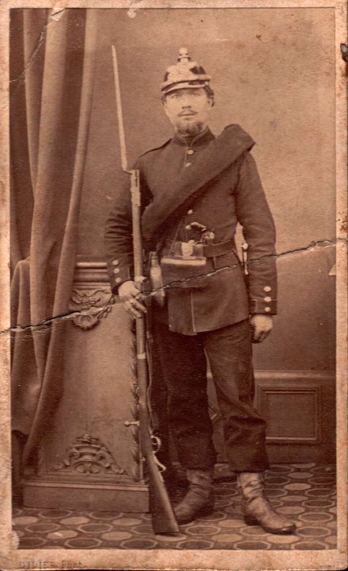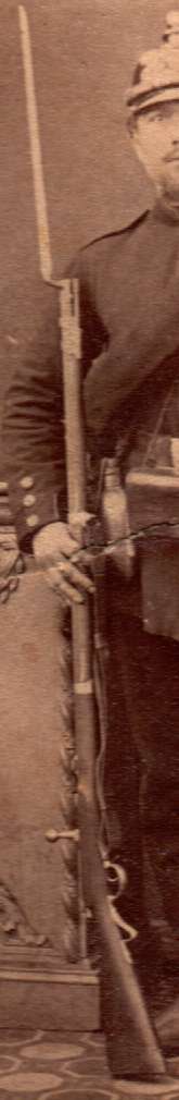 | Der Soldat auf diesem Bild ist ein badischer Artillerist, und führt ein Zündnadelgewehr M62 mit aufgepflanztem Bajonett, sowie angehängt einen badischen Yatagan 1853/55.				 Das Gewehr mit Bajonett stammt vermutlich aus dem Fundus des Photographen, denn sein eigenes Bajonett hat der Soldat ja anhängen. Ebenso dürfte der Stiftfeuerrevolver im Koppel des Soldaten vom Photographen gestellt worden sein. Das Bild wurde in Frankreich (Luneville in Lothringen), aufgenommen. Leider ist das Bild geknickt, und dadurch beschädigt.  |