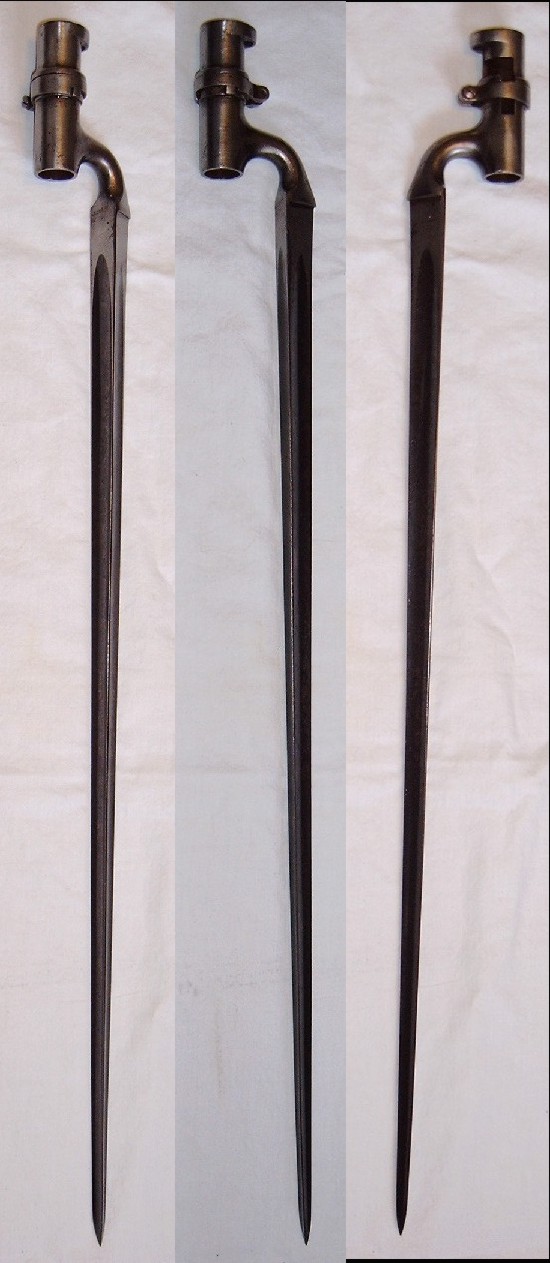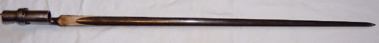 Das Modell 1876 fällt eigentlich aus dem Rahmen meines Sammelgebietes, da es sich um ein Tüllenbajonett handelt, welche ich ja eigentlich aus meiner Sammlung ausgenommen habe. Aber nunja, Ausnahmen gibt es immer wieder ...! Das Modell 1876 ist für einen einschüssigen Hinterlader, das Martini-Henry-Gewehr, bestimmt. Das vorliegende Stück ist leider ohne Scheide. Es wurde wohl arsenalüberholt, wie aus dem Klingenstempel 'R' zu deuten ist, außerdem sich einige alte Stempel nur noch schwach zu erkennen. Nachtrag: Der Stempel "R" steht wohl für "rusty", also rostig. Dies würde auch die Überarbeitung der Klinge erklären. |