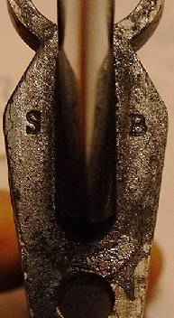 Auf der Unterseite der Parierstange sind ein B und ein S eingeschlagen. Dies sind Herstellermarken von BSA, Werk Shirley, Birmingham. Daß es ein L1A3 ist erkennt man schlicht an der Beschriftung, aber auch z. Bsp. an der Vertiefung um den Drücker herum. Die Klinge ist teilweise poliert. |