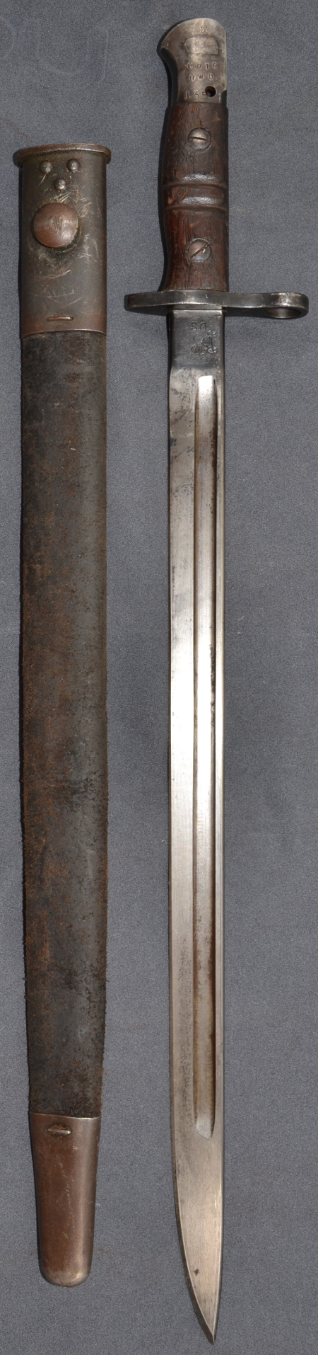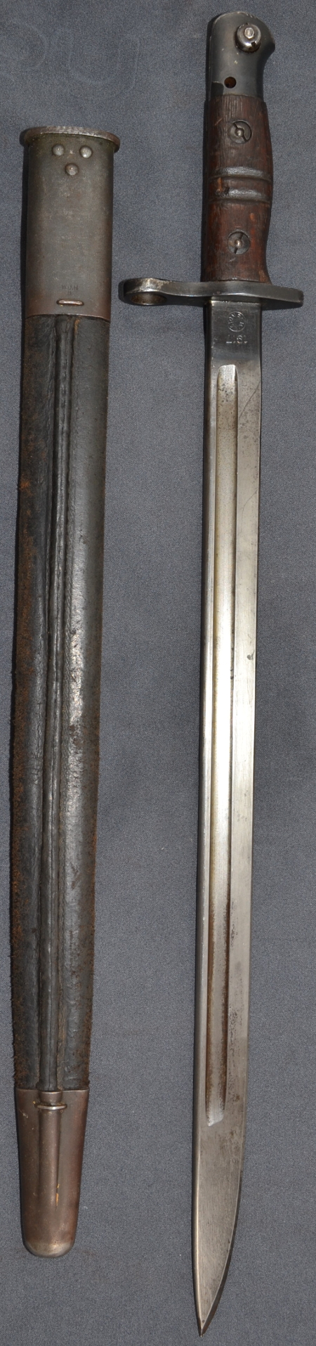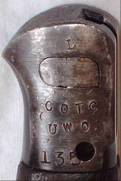 "L COTC U WO 135 " was evtl. Cambridge University OTC bedeuten könnte, von der Art her aber sicher ein englicher Truppenstempel ist. Darunter ist noch ein gelöschter alter Truppenstempel zu erahnen. Somit ist das Bajonett bei England einzureihen. Eine dann auch passende 1907er-Scheide wurde ergänzt. |