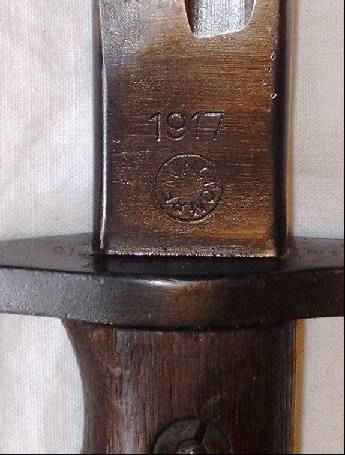 | Dieses Bajonett wurde bei Remington gefertigt. Es trägt keine britischen Abnahmestempel, die auf eine britische Verwendung schließen lassen. Trotzdem war es wohl in England im Einsatz, denn es trägt den Truppenstempel