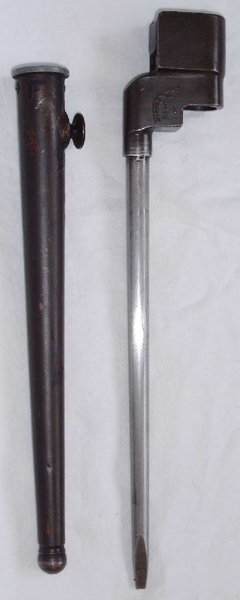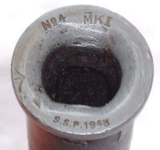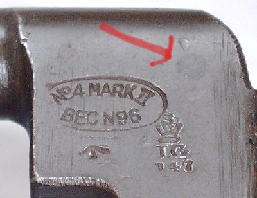 | unten: Die Herstellermarke, der Abnahmestempel, und markiert der Stift, der die Klinge sichert | |