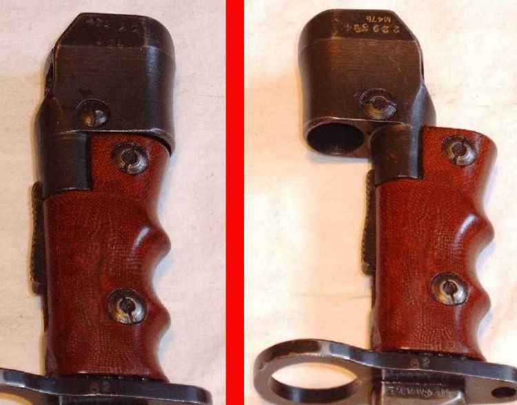 | Dieses Bajonett trägt eine codierte Herstellermarke, was evtl. auf eine Kriegsfertigung (also ein frühes Stück) schließen läßt.