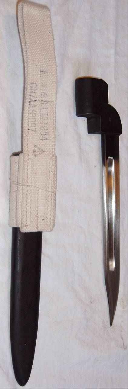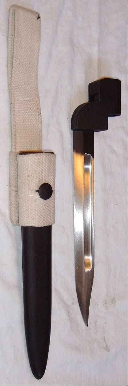 Es hat eine polierte Klinge und ist in der zugehörigen Scheide versorgt.
