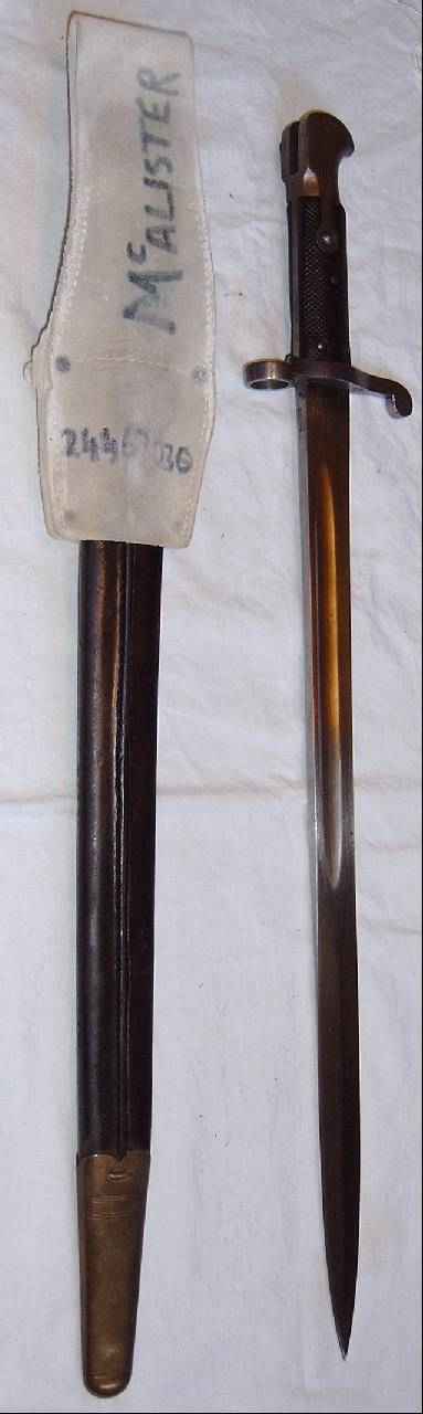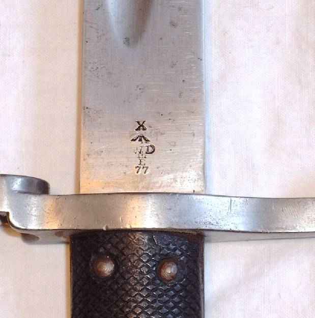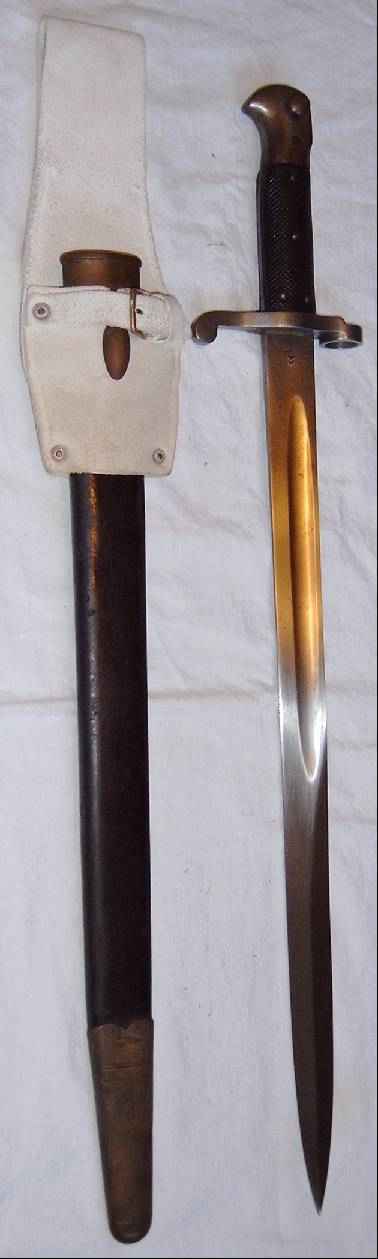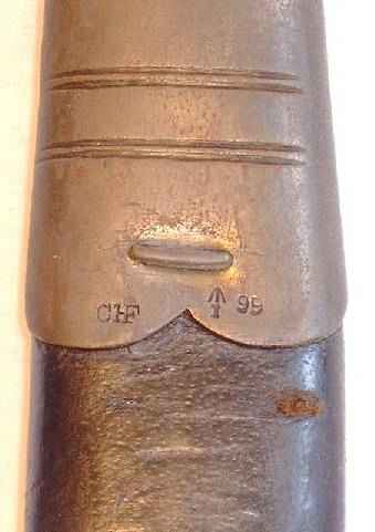 Ein Hersteller ist nicht markiert, dies war erst ab 1895 üblich. Die Scheide ist messingmontiert, und somit als indisch zu identifizieren. Wie bereits beschrieben hat das Mk I eine Hohlkehle, und 4 kleine Nieten als Griffschalenbefestigung, zudem eine außenliegende Blatt-Drückerfeder. |