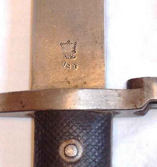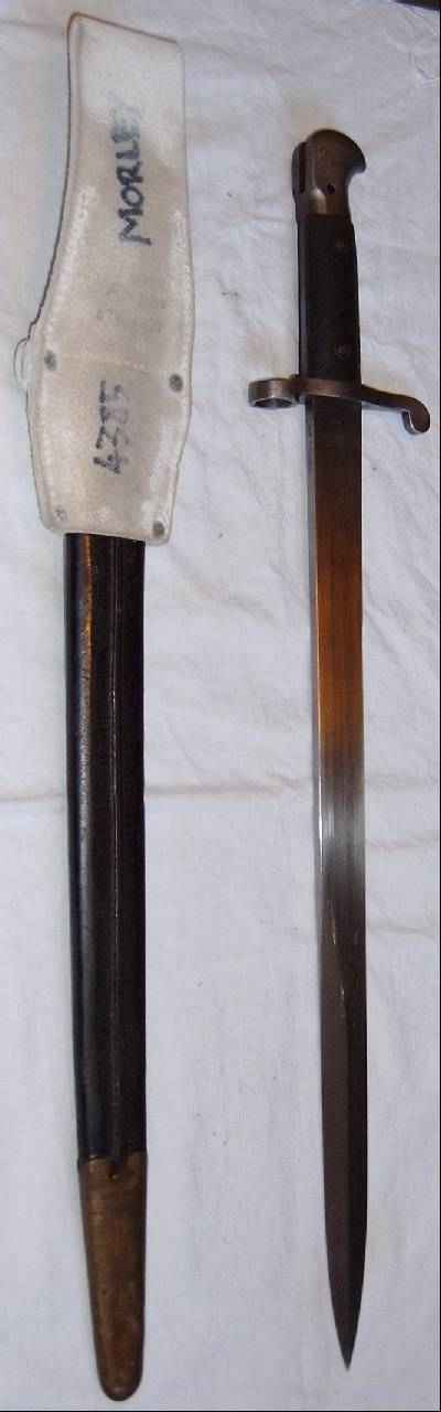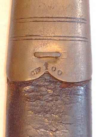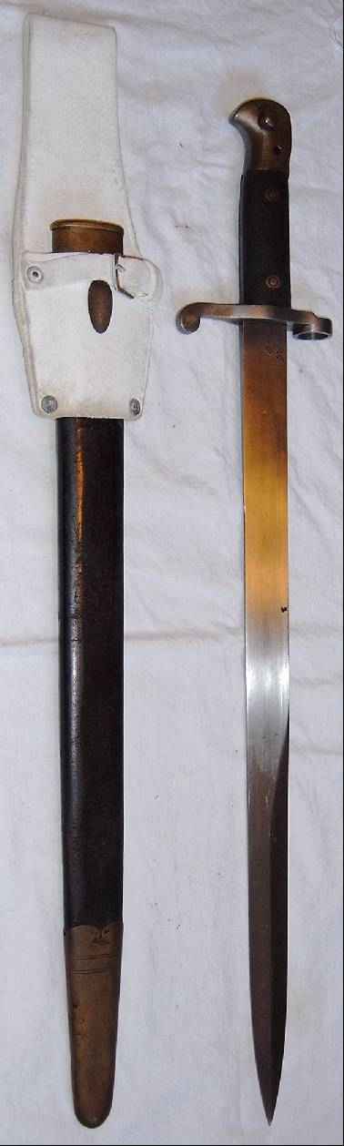 Ein Hersteller ist nicht markiert, dies war erst ab 1895 üblich. Die Scheide ist messingmontiert, und somit als indisch zu identifizieren. Wie bereits beschrieben hat das Mk III keine Hohlkehle, und 2 große Nieten als Griffschalenbefestigung, zudem eine innenliegende Spiral-Drückerfeder. |