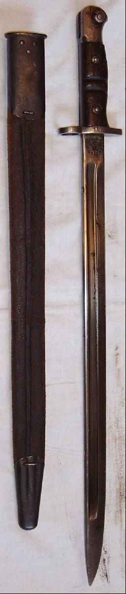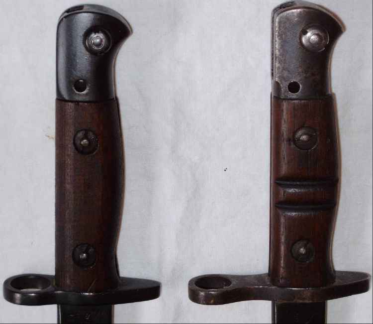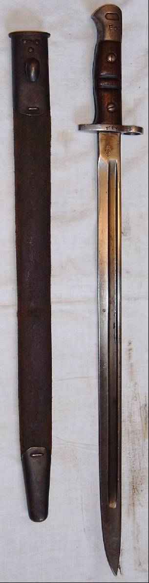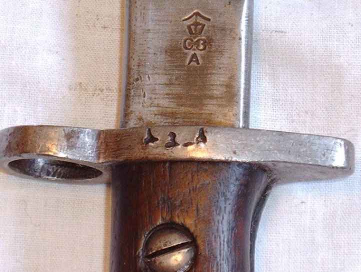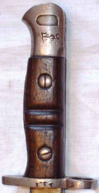 Die Klinge, die Griffschalen und vermutlich auch das Gefäß außer der Parierstange stammen von einem P13, gefertigt 1916 bei Remington. Die Parierstange ist jedoch eindeutig von einem P 1907, wie unschwer am Durchmesser des Mündungsringes, und an dessen Distanz zum Gefäßrücken zu erkennen ist! Die Beschriftung und weitere Indizien deuten auf eine Fertigung für Indien hin! Vermutlich also eine Hilfslieferung der USA an Indien unter Verwendung von zuvor nicht verwendeten P13-Teilen. |