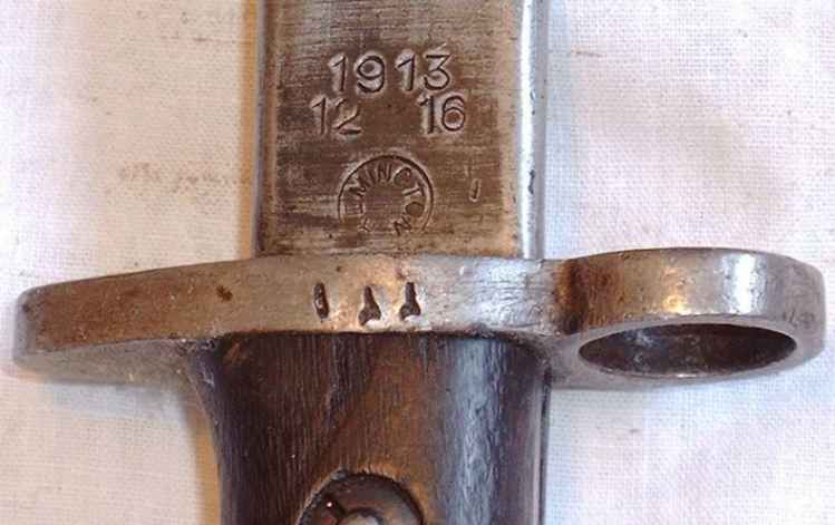 | unten: Das Modell und das Herstellungsdatum der Klinge: Modell 1913, Dezember 1916, sowie der Hersteller: Remington, und auf der Parierstange Farsi-Ziffern | |