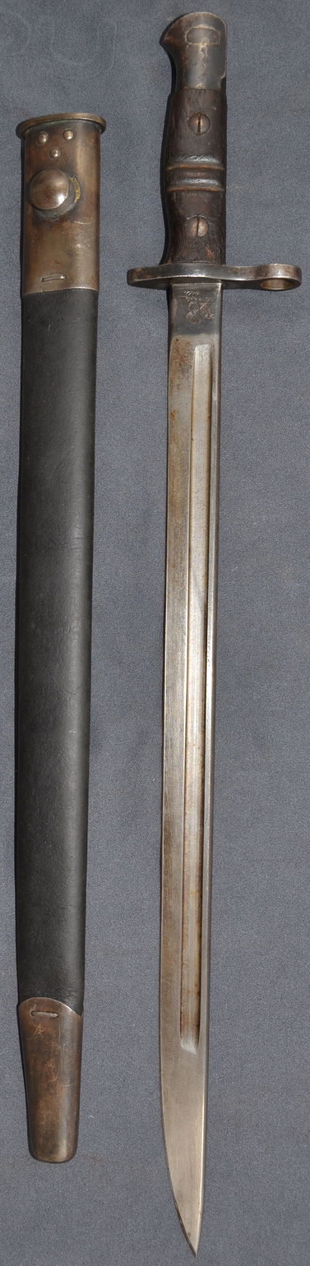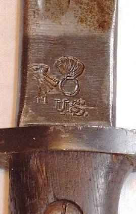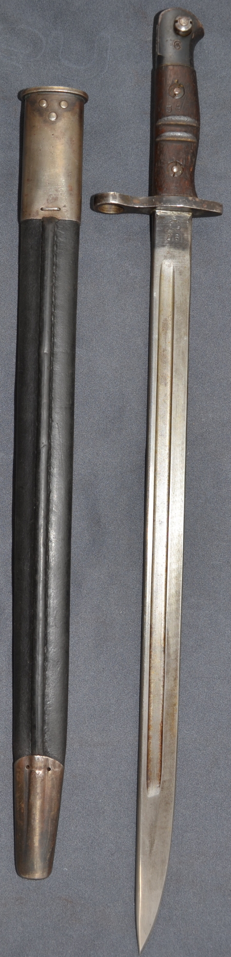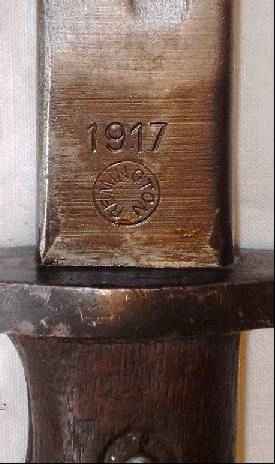 Es trägt einen kanadischen Broad Arrow, so daß dieses Stück wohl eine Hilfslieferung während des Zweiten Weltkrieges war. Ob es direkt an Kanada ging, oder erst über England dorthin gelangte, ist nicht mehr nachvollziehbar. Eine zu Kanada passende 1907er-Scheide wurde ergänzt. |