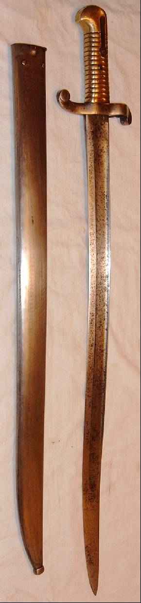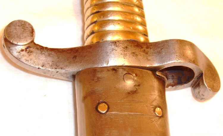 | Das vorliegende Stück wurde 1849 in Châtellerault hergestellt, und trägt keinen Stempel als Hinweis auf den Verwendungszweck "M" oder "C". Der Durchmesser des Mündungsringes beträgt knapp 22mm, so daß das Bajonett für den Mousqueton vorgesehen war.