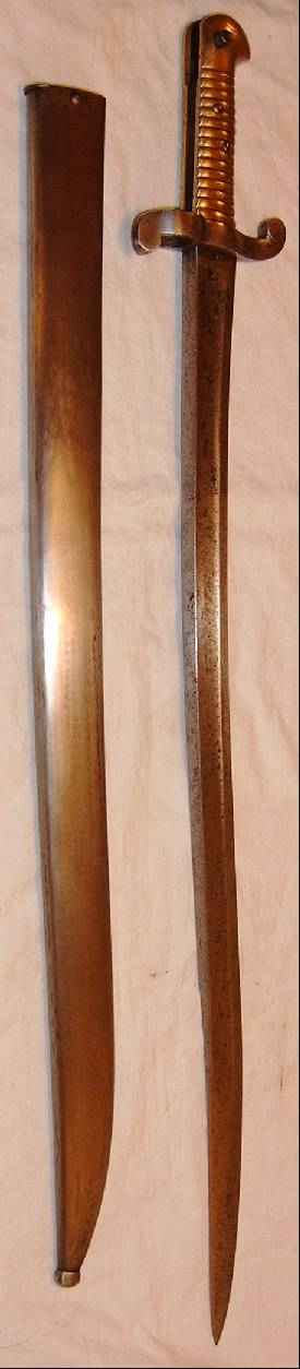 Die Klingeninschrift lautet (ausgeschrieben/ergänzt): Manufacture Nationale Châtellerault 1849. Die Hohlkehle ist sehr breit, ähnlich dem Mle. 1840, der Abschluß der Parierstange ist scharfkantig. Der Tragebügel der Scheide wurde sauber entfernt; wann und warum läßt sich leider nicht mehr nachvollziehen. |