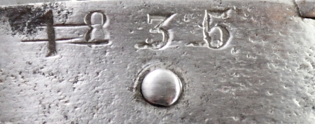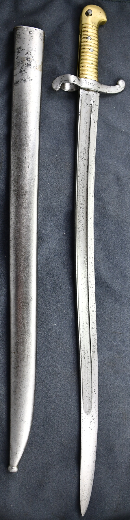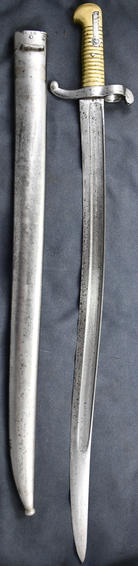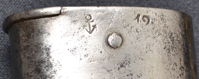 | Das vorliegende Stück wurde 1855 in Châtellerault hergestellt, und trägt keinen Stempel als Hinweis auf den Verwendungszweck "M" oder "C". Der Durchmesser des Mündungsringes beträgt rund 23mm (ist allerdings etwas verformt, aber gut messbar), so daß das Bajonett für den Carabine vorgesehen war. Die Klingeninschrift ist nur teilweise lesbar, xxx Châtellerault Mars(?)1855. Die Hohlkehle ist schmal, der Abschluß der Parierstange abgerundet - die typische späte Variante. Die Parierstange trägt einen Anker, ein Zeichen sowohl der Marine als auch von Kolonialtruppen, so daß die Verwendung nicht ganz klar ist. Auch die nicht nummerngleiche, also ergänzte, Scheide trägt einen Ankerstempel, allerdings eine andere Variante. |