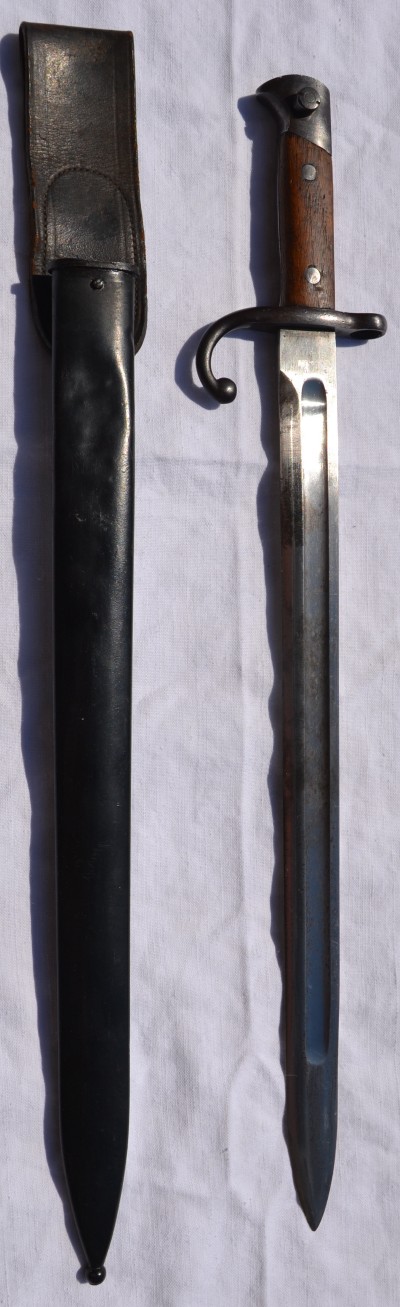 Das vorliegende Stück fällt exakt in diesen Seriennummernbereich. Beim vorliegenden Stück ist sogar der integrierte Lederhänger der Scheide erhalten. |