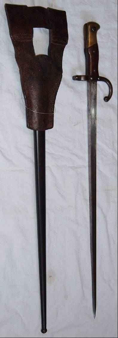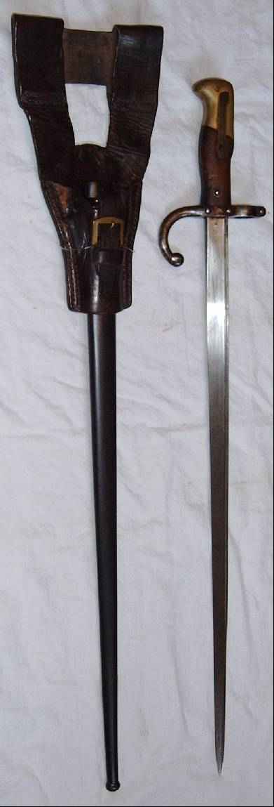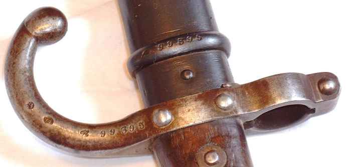 Dieses neue Bajonett wich in seiner Konzeption erstmals von seinen Vorgängern ab. Die Klinge hatte keine Jataganform mehr, sondern nun einen Steckrücken, somit also einen T-förmigen Querschnitt. Auch der Griff war nicht mehr völlig aus Messing, sondern hatte nun Holzgriffschalen. Das vorliegende Stück wurde 1877 bei Tulle gefertigt, und ist nummerngleich. |