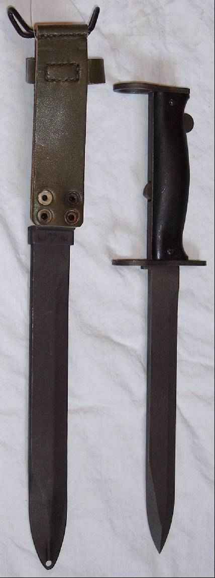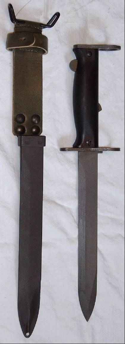 Versorgt ist es korrekt in einer Scheide 1958, was an der kurzen Verengung in der Dicke der Scheide zu erkennen ist. Die Nieten und der Verschlußknopf der Scheide sind lackiert. Das Bajonett trägt die Markierung MAS 69 , Scheide: MAT F. |