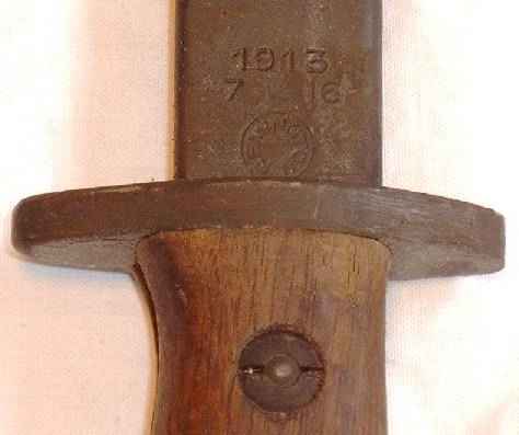 Es handelt sich um ein ehemals britisches P13-Bajonett aus Remington-Fertigung (Juli 1916). Der Mündungsring wurde entfernt und die Klinge gekürzt. Eine ehemals amerikanische M1917-Scheide wurde ebenfalls gekürzt, und statt der entfernten US-Aufhängung ein neuer Leder-Aufhänger angebracht. Das Messer wurde in dieser Form bei der französischen Armee eingesetzt. |