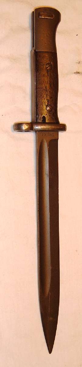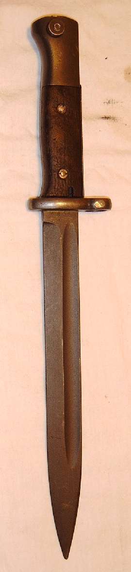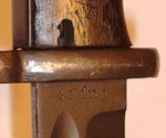 Es wurde aptiert, indem ein Mündungsring angebracht wurde. Dabei wurde es auch phosphatiert, und auch neue Holzgriffschalen angebracht. Anschließend wurde es mit israelichen Abnahmestempeln versehen. Die ursprünglichen deutschen Stempel sind noch vorhanden. Leider fehlt die zugehörige Scheide. Diese entspricht ebenfalls dem deutschen Modell, bzw. wurde zumindest teilweise daraus aptiert, indem ein schräger Tragebügel statt des Tragehakens angebracht wurde. |