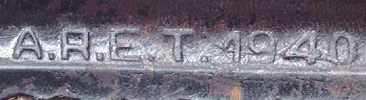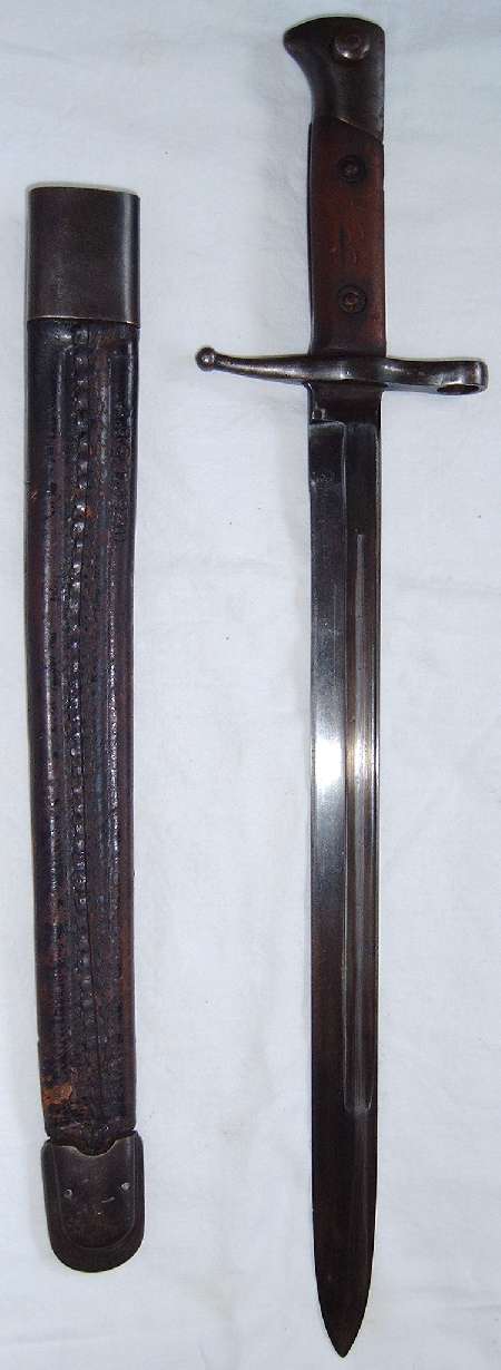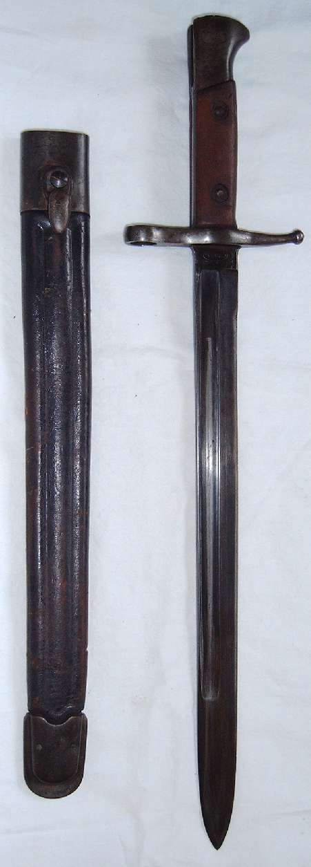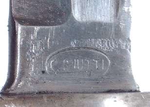| Dieses Bajonett ist in einer eisenmontierten Lederscheide versorgt. Es ist wohl leider überarbeitet worden; die Parierstange ist leicht verbogen, die Herstellermarke teilweise ausgeschliffen. Der Hersteller ist Gnutti. Im Leder der Scheide ist ein Stempel A.R.E.T. 1940 zu erkennen. |