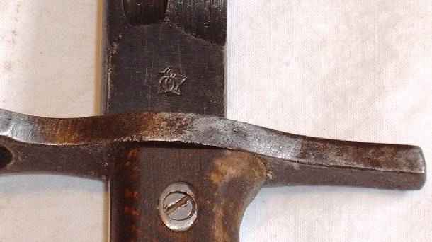 | unten: Die Griffbefestigung, das Herstellerlogo sowie Form der Parierstange | |