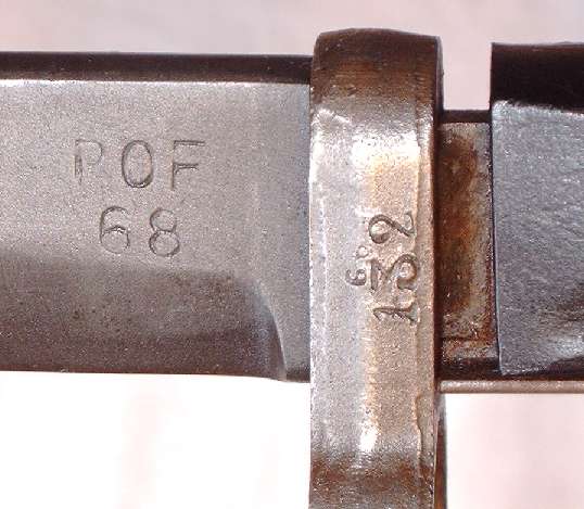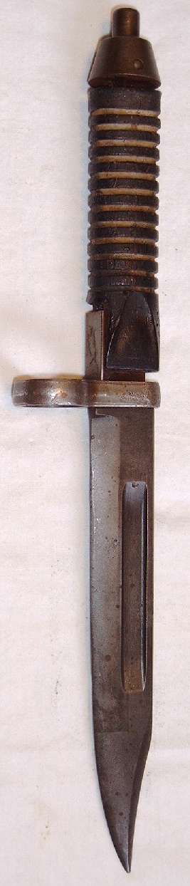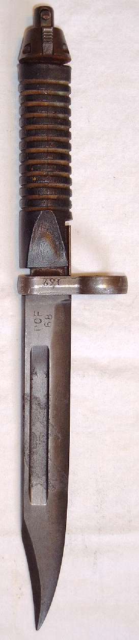 | Hierbei handelt es sich um eine pakistanische Produktion für die ebenfalls in Lizenz gefertigten G 3 - Gewehre. Das Bajonett weicht in seiner Klingenform deutlich von den üblichen G 3 - Bajonetten ab, indem es eine Bowieklinge trägt. Das vorliegende Stück ist leider in schlechtem Zustand, selbst das Griffmaterial ist geschrumpft. |
