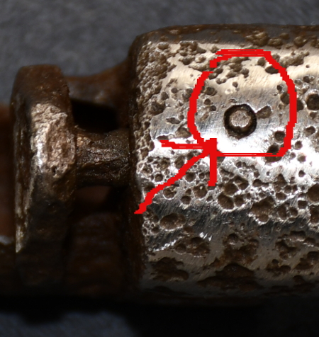 | unten: Die Tülle, bei der der Drücker abweichend von "normalen" 91/30-Tüllen verstiftet ist (von unten statt seitlich) | ||||