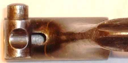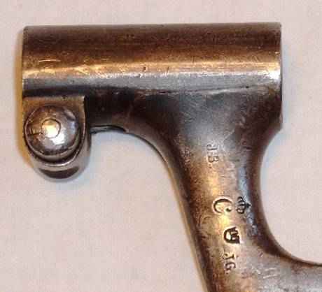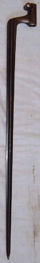 Für dieses neue Bajonett wurden die Klingen der alten M 1867 verwendet, diese wurden mit Hartlot in neue Tüllen eingelötet. Interessant ist die Befestigung per Drücker, nicht per Ring wie sonst bei Tüllenbajonetten. |
