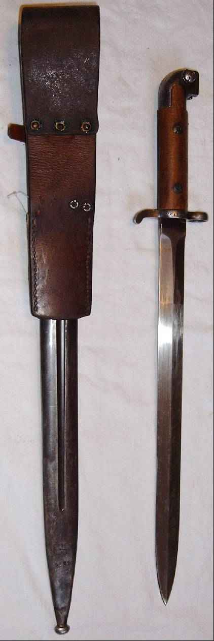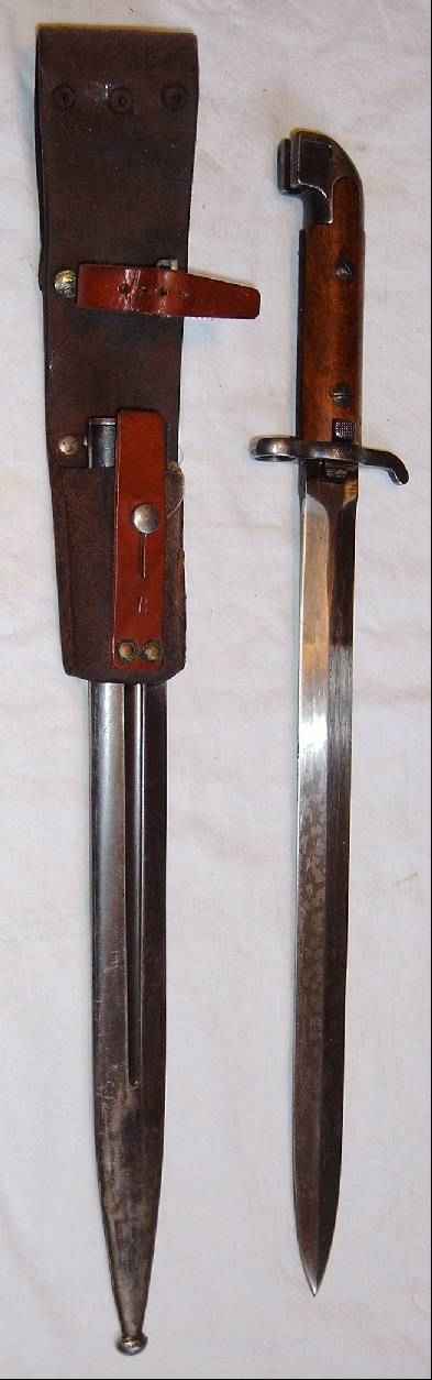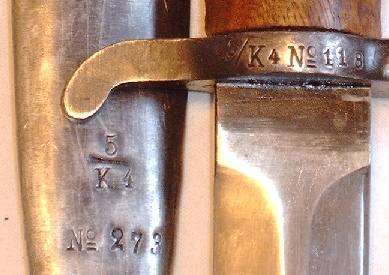 Zu Beginn wurde für diesen Karabiner gar kein Bajonett vorgesehen, doch dann wurden die Karabiner (teilweise) mit Bajonetthaften nachgerüstet, und das M 1914 eingeführt. Um die Kürze des M 94 etwas auszugleichen ist das Bajonett deutlich länger als das M 96-Bajonett des langen Gewehres. Das vorliegende Bajonett ist leider nur fast nummerngleich, die Kompanie ist identisch, die Waffennummer jedoch nicht. |
