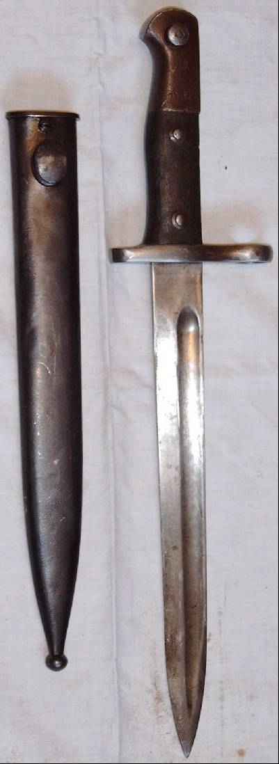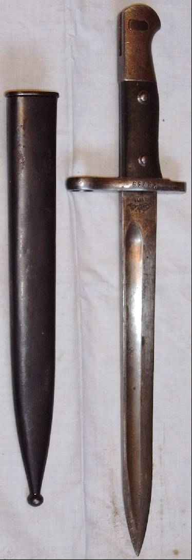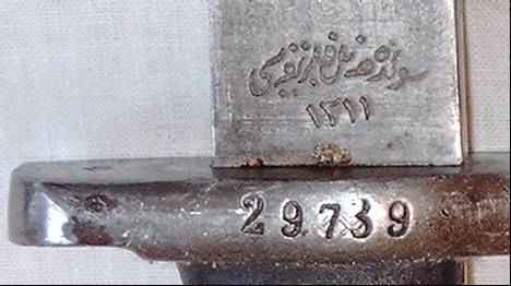 | Dieses Bajonett war vor der Kürzung (siehe hierzu die Übersichtsseite) ein Bajonett M1890, in Deutschland gefertigt, aber in arabischer Schrift markiert.