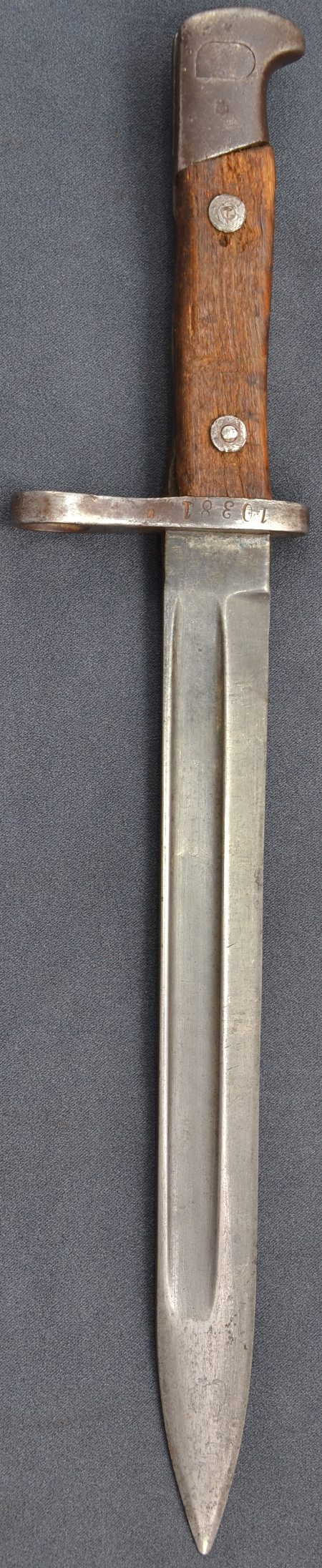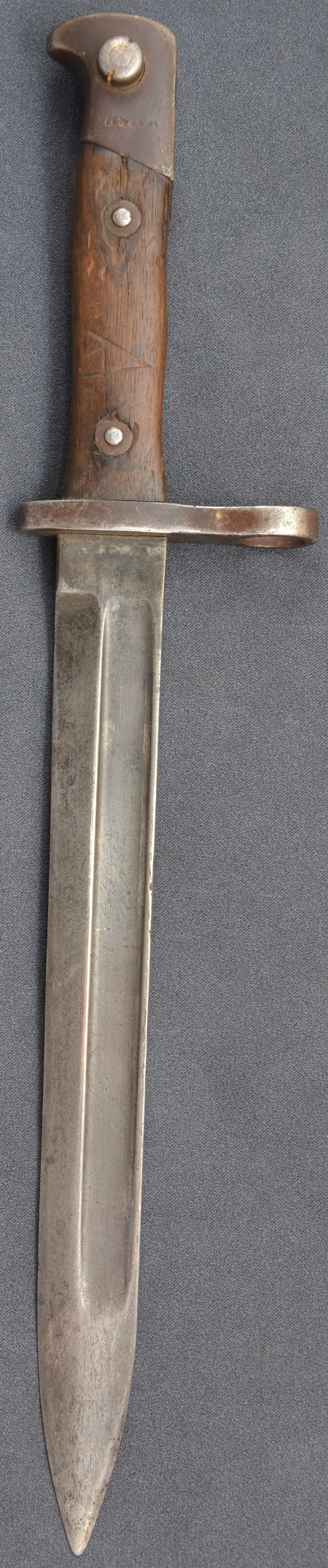 Dieses Bajonett war vor der Anbringung einer neuen Parierstange für das türkische Gewehr M35 ein rumänisches Bajonett M1903, vermutlich in Österreich bei OEWG gefertigt, aber es ist keine Herstellermarke vorhanden. Die Scheide fehlt leider. |