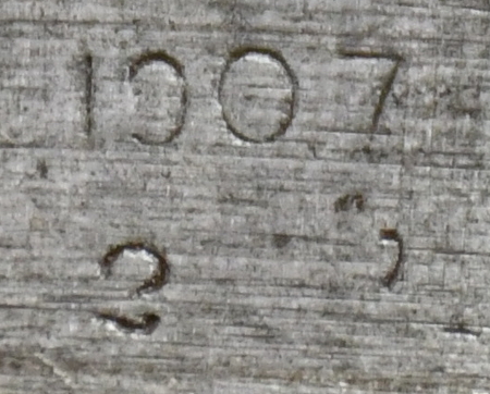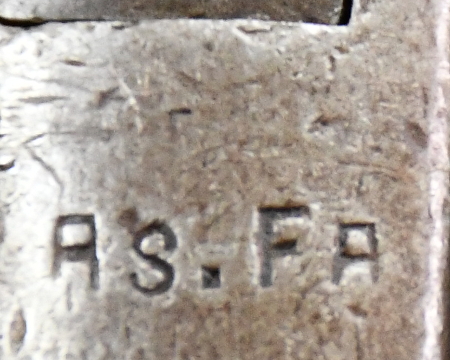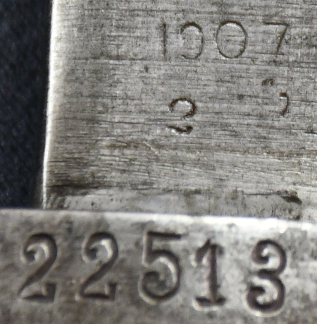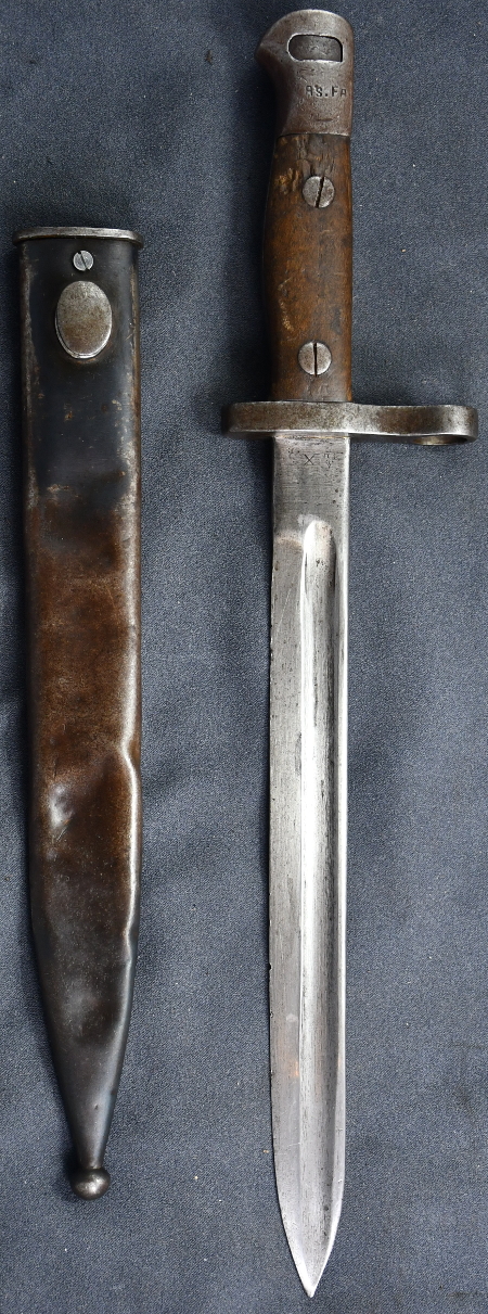 Die ursprünglichen Markierungen sind fast völlig entfernt, so daß weder der Hersteller noch das Fertigungsdatum erkennbar sind. Allerdings deutet das fehlende Reinigungsloch im Knauf darauf hin, daß es vor 1916 gefertigt wurde. Die Klinge ist auf das typische M35-Maß gekürzt. Im Knauf ist die typische AS.FA-Markierung. Die Scheide ist eine typische Scheide für das Modell 35. Deren Schraube für den Mundblecheinsatz ist falsch ersetzt worden. |