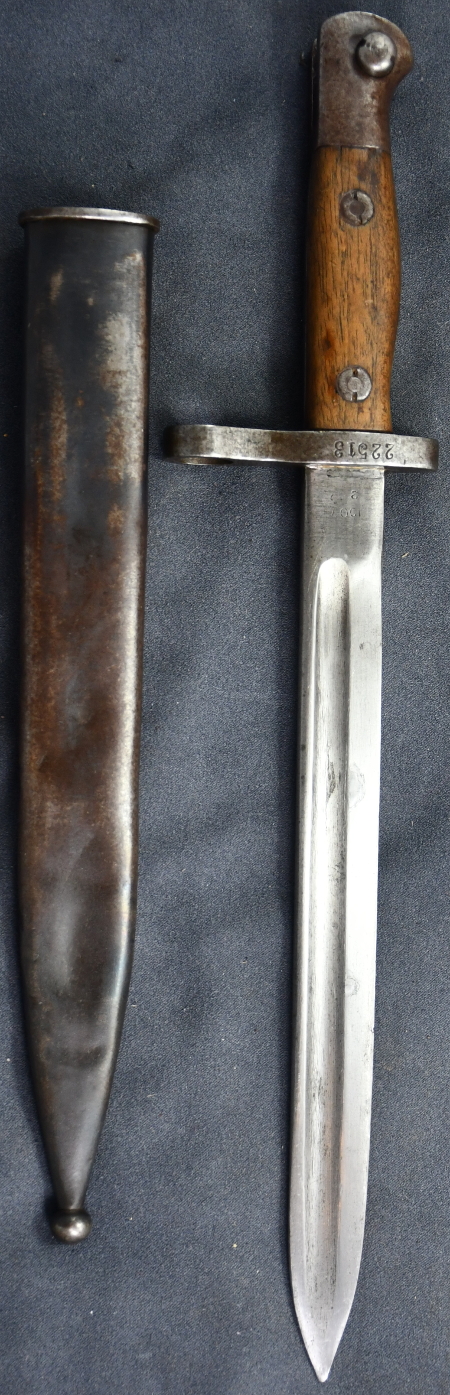 | Dieses Bajonett war vor der Anbringung einer neuen Parierstange für das türkische Gewehr M35 ein britisches Bajonett P1907.