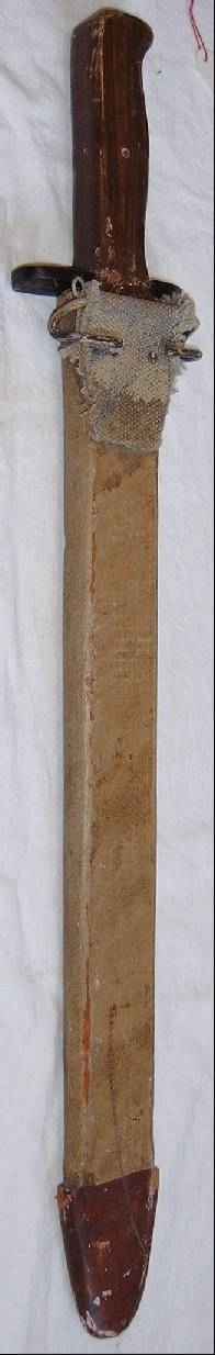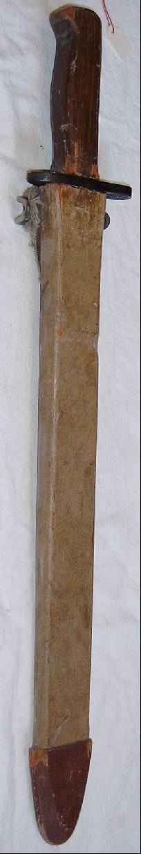 | Dieses "Bajonett" ist komplett aus Holz. Der Scheidenkorpus und der Griff sind aus 1 Stück, die Parierstange ist angesetzt.
