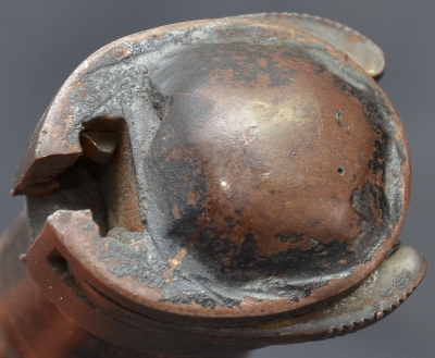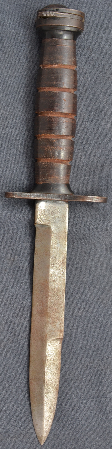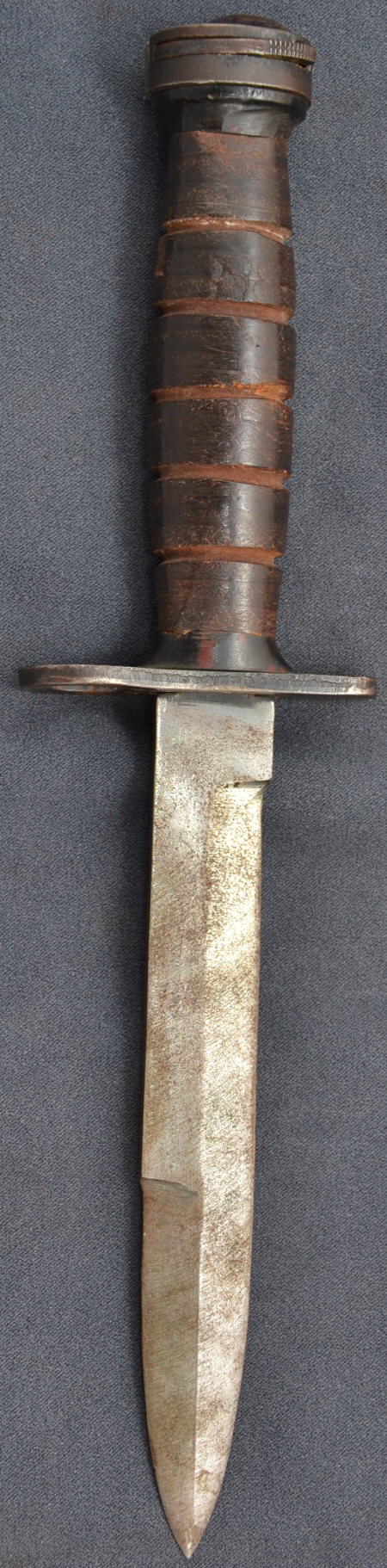Da die Klinge massiv überschliffen wurde sind auch evtl. zuvor vorhandene Stempel in der Klinge nicht mehr vorhanden. Der Knauf wurde wohl nachgeschweißt, evtl. weil die Klinge locker wurde? Eine Scheide ist nicht vorhanden. Eventuell handelt es sich um eine Kiffe-Produktion? Da mir eine Zuordnung nicht möglich ist führe ich das Stück bei den USA. Für Hinweise zu dem Stück wäre ich dankbar! |