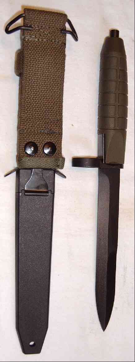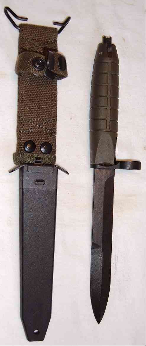 Das Bajonett wurde und wird in großen Stückzahlen gefertigt und in viele Länder exportiert, aber auch auf dem zivilen Markt verkauft. Oft sind die Bajonette nicht gekennzeichnet, so daß der Verwendungszweck, militärisch oder zivil-kommerziel, nicht offensichtlich ist. Das Material des Griffes und der Scheide differiert häufig, der vorliegende Griff ist aus grünem Kunststoff. |